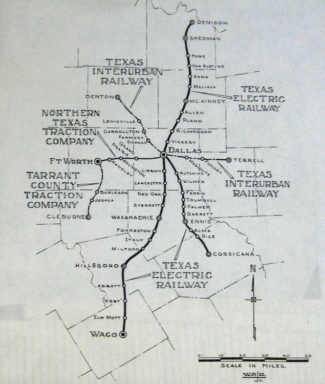 During that time, several electric railways radiated out from Dallas, to Cleburne, Corsicana, Denison, Denton, Terrell, and Waco. They provided frequent passenger and package service to both the large and small communities on their routes. Not only did they have scheduled stops at West, Abbott, Hillsboro, and Milford, but they would also stop for riders at rural crossroads and in front of their houses.